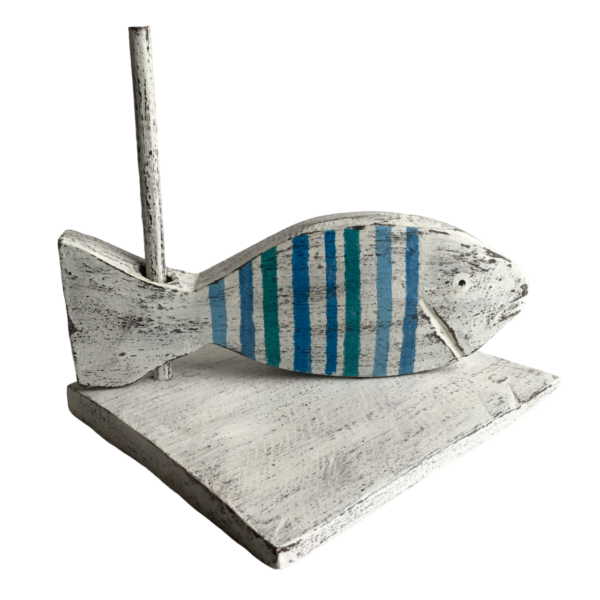Servilletero con pez, elaborado en madera pintado y decorado a mano en estilo envejecido. Disponible en Blanco y azul.