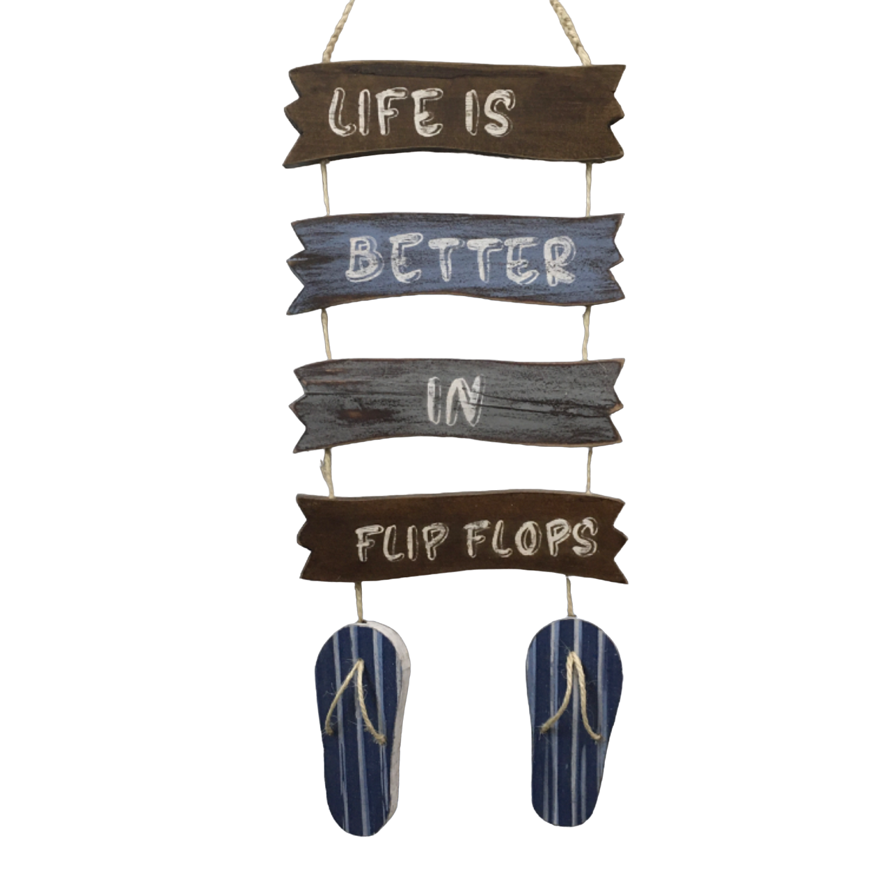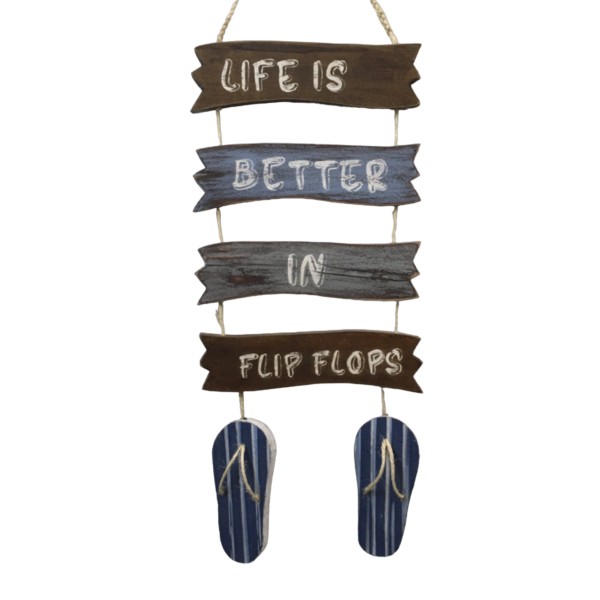 Dale ese toque de inspiración marina a tu decoración con este letrero que invita a vivir una vida menos ajetreada, más relajada. LIFE IS BETTER IN FLIP FLOPS, la vida en chanclas es mejor. Pintado a mano en estilo envejecido y en colores marinos.